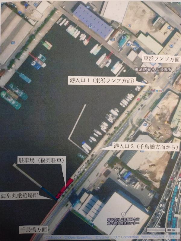 東浜船溜まりに到着、一番奥突き当りが駐車スペースです。