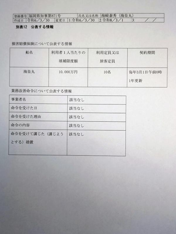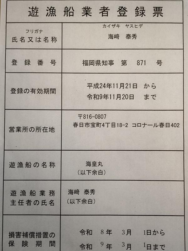 遊漁船業者登録票